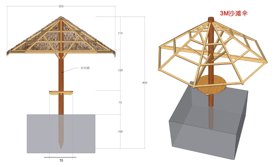 傘架結(jié)構(gòu):防腐木質(zhì) 或 鋼結(jié)構(gòu)。